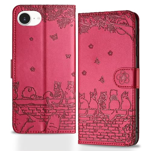 Butnyeoe Coque pour iPhone 16e Rabat,Housse Pochette iPhone 16e Clapet,Portefeuille Etui avec Porte-Carte et Dragonne,Chats/Fleur PU Cuir/Antichoc Flip Folio Case.Rouge