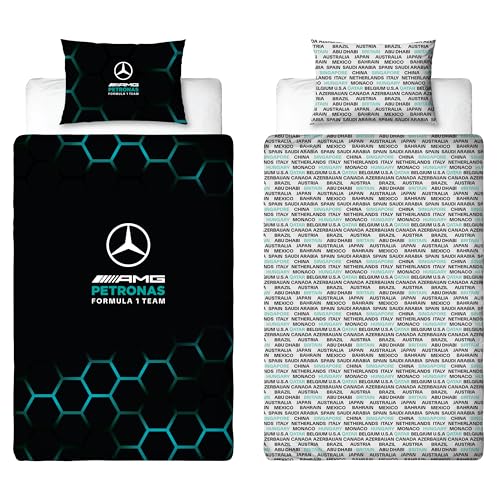 Set Housse de Couette Simple Officielle Mercedes AMG Petronas, Design Ridge | Housse de Couette Réversible Bleu 2 Faces Formula 1, Produit Officiel, Comprend Taie d’Oreiller Coordonnée | Polycoton