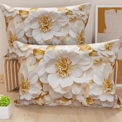 PETTI Artigiani Italiani - Lot de 2 Taies d'Oreillers 70x40 cm 100% Microfibre Hypoallergénique, Housse Oreiller Rectangulaire Motif Floral Blanc Doré, Paquet de 2, Fabriqué en Italie