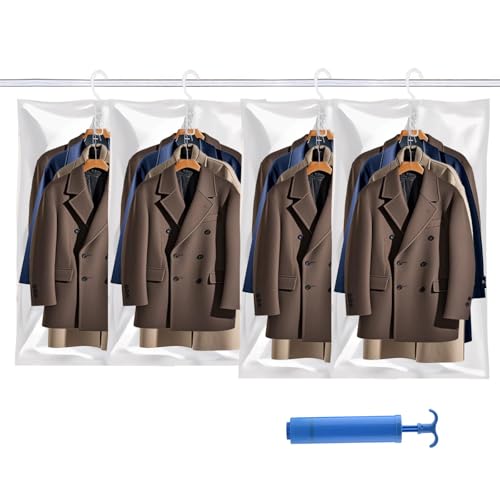 QH7 Lot de 4 sacs de Rangement sous Vide Suspendre pour vêtements,Transparents et réutilisables Housse sous vide pour vetement,pour costumes,costumes, robes, manteaux ou vestes