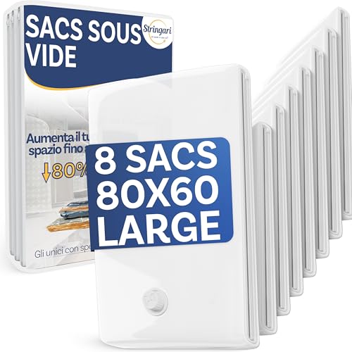 Stringari Sac Sous Vide Vetement Aspirateur Lot de 8 pièces L 80x60 - Sac de Rangement Sous Vide De Qualité Supérieure - Housse Aspirable Rangement Les Seules Avec une Épaisseur de 90 Microns