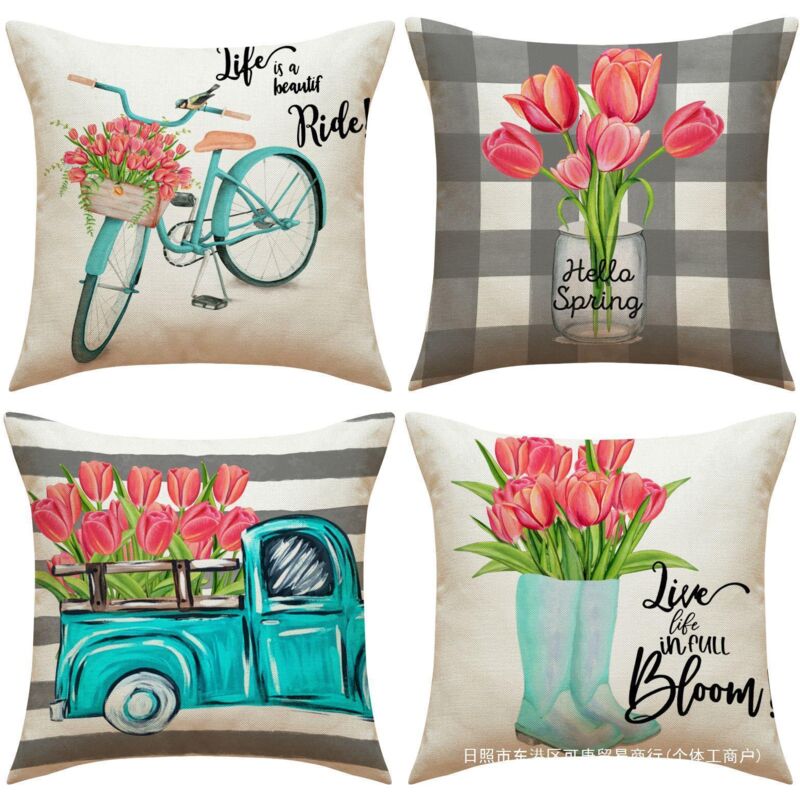 Lot de 4 Housses de Coussin Extérieur, Imperméable, Lin Moderne, 45x45 cm, Motif Fleurs Printanières, Décor Canapé, Jardin