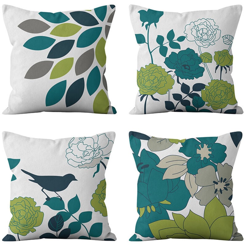Lot de 4 housses de coussin d'extérieur (45 x 45 cm) imperméables à motif de fleurs et d'oiseaux bleus et verts pour canapé, terrasse, jardin, salon,