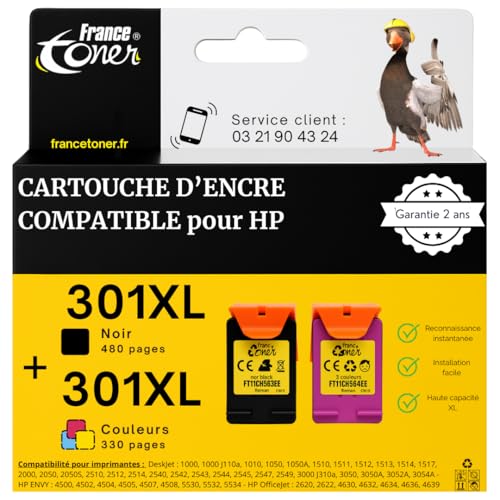 FranceToner - 301XL - Cartouches Compatibles pour HP 301 XL Noir et Couleurs – Encre pour HP DeskJet 1000, 1010, Envy 5530, 4500, 4501, OfficeJet 2600, 2622, 2624 (301XL Noir et Couleurs)