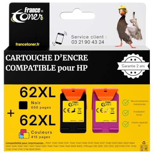 CARTOUCHINK, Entreprise française - 62XL - 2 Cartouches d'encre Compatibles avec HP 62 XL - pour HP Envy 5640 5540 7640 5547 5548 5642 5644 OfficeJet 5740 5742 (1 Noir et 1 Couleur)