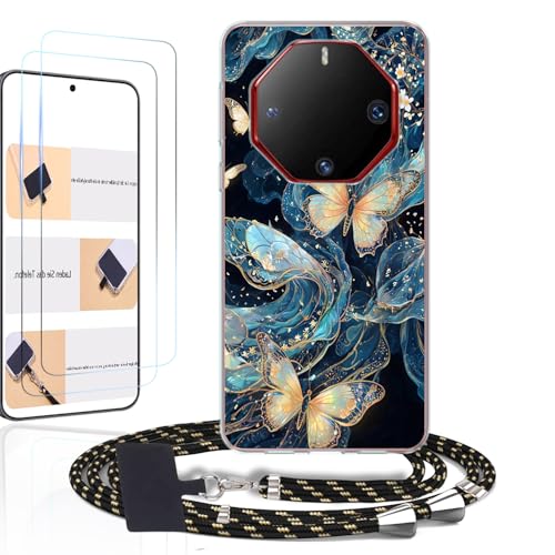WUACYEAMING Coque pour Huawei Mate 60 RS Ultimate,avec Cordon & 2 Verre Trempé,Transparent Coque Collier Réglable Téléphone Étui Portable Lanyard Case Papillon à Motifs