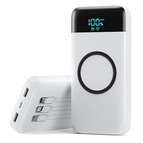 Batterie Externe sans Fil 26800mAh, 7 en 1 Powerbank Fast Charging avec 3 ports et 3 câbles, 25W PD3.0+QC4.0 Chargeur externe portable avec écran LCD Compatible avec iPhone Huawei Samsung Xiaomi-Blanc