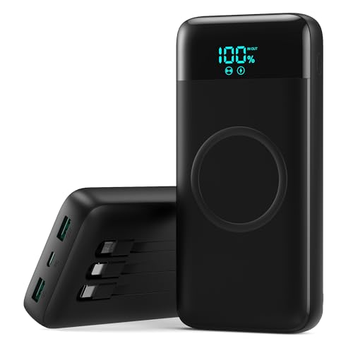 Batterie Externe sans Fil 26800mAh, 7 en 1 Powerbank Fast Charging avec 3 Ports et 3 câbles, 25W PD3.0+QC4.0 Chargeur Externe Portable avec écran LCD Compatible avec iPhone Huawei Samsung Xiaomi-Noir