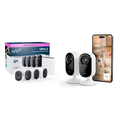 Arlo Ultra 2 4K avec SmartHub Plus Caméras intérieure (2), Caméra Video Surveillance WiFi Exterieure sans Fil, Vision Nocturne Couleur, Compatible Alexa, Essai Secure Inclus, 4 Caméras Blanches