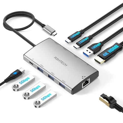 RSHTECH 9 en 1 USB C Hub Multiport Adapter avec 4K HDMI, 10Gbps USB3.2 Ports (2C + 1A), 3 USB-3.0 5Gbps Data Ports, 100W PD, Gigabit Ethernet, Aluminum USB-C Dongle for MacBook, Laptops and More