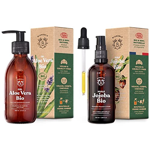 Bionoble Gel Aloe Vera Bio 100% Pur Aloe 200ml - Flacon Verre Recyclable + Pompe - Gel Aloe Vera Cheveux Bouclés & Huile de Jojoba Bio 100ml - 100% Pure, Naturelle et Pressée à Froid