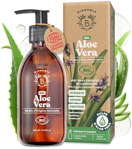 BIONOBLE Gel Aloe Vera Bio 97% avec Huile Essentielle de Lavande - Gel Aloe Vera Cheveux Bouclés 100% Pur Pulpe - Hydrate, Apaise - Visage, Coup de Soleil, Corps, Rasage - Flacon Verre, Pompe - 200ml