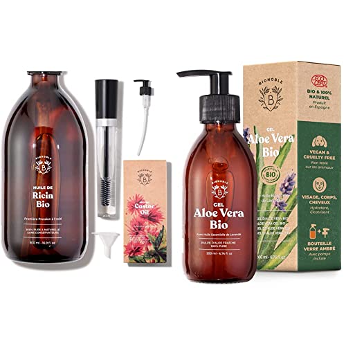 Bionoble Huile de Ricin Bio 500ml - 100% Pure, Naturelle et Pressée à Froid & Gel Aloe Vera Bio 100% Pur Aloe 200ml - Flacon Verre Recyclable + Pompe - Gel Aloe Vera Cheveux Bouclés