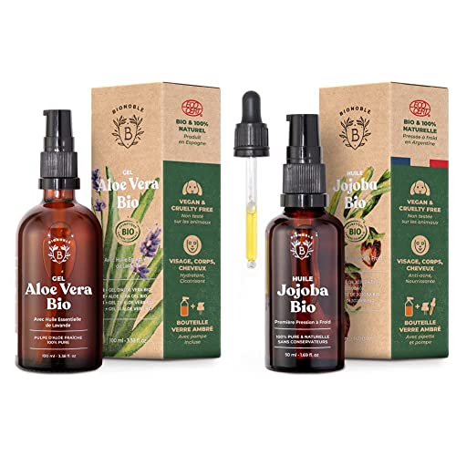 Bionoble Gel Aloe Vera Bio 100% Pur Aloe 100ml - Flacon Verre Recyclable + Pompe - Gel Aloe Vera Cheveux Bouclés & Huile de Jojoba Bio 50ml - 100% Pure, Naturelle et Pressée à Froid