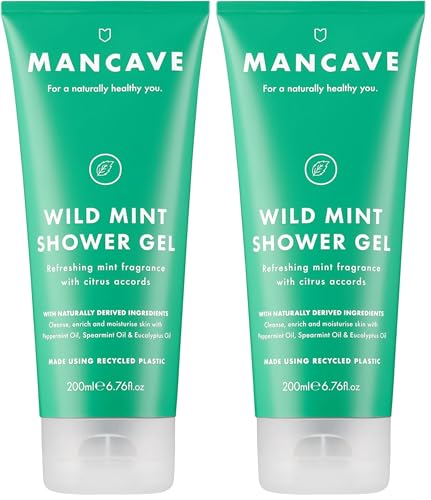 ManCave Gel Douche Menthe Sauvage - Gel Douche Hommes 200 ml, Arôme Énergisant et Frais de Citron, Menthe Poivrée et Huile d'Eucalyptus, Naturel avec L-Arginine, Sans Sulfate ni Parabène, Vegan