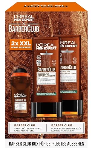 L'Oréal Men Expert Kit de soin pour homme, coffret cadeau avec gel douche XXL et déodorant roll-on, cadeaux pour homme avec gel douche et déodorant roll-on à l'huile de bois de cèdre, Barber Club, 2 x