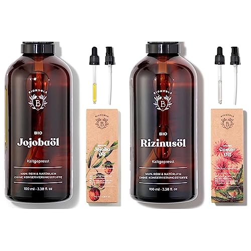 Bionoble Huile de Ricin Bio 50ml - 100% Pure, Naturelle et Pressée à Froid - Cils, Sourcils, Corps, Cheveux, Barbe, Ongles & Huile de Jojoba Bio 50ml - 100% Pure, Naturelle et Pressée à Froid