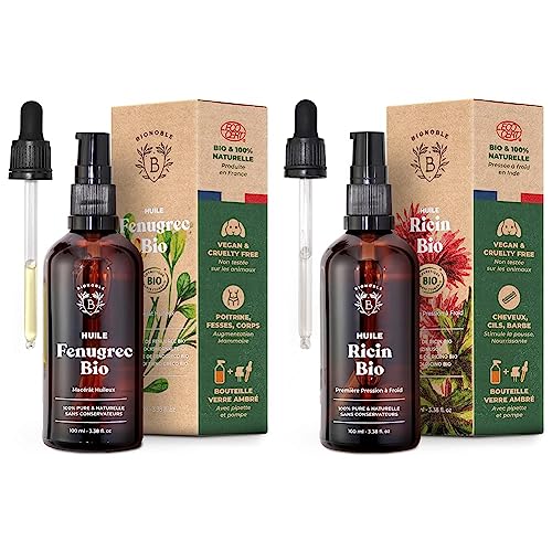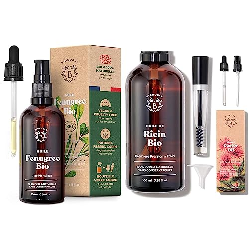 Bionoble Huile de Fenugrec Bio 100ml - Macérât Huileux de Fenugrec et Huile de Tournesol - Corps, Poitrine, Fesses, Cheveux, Ongles & Huile de Ricin Bio 100ml - Huile Pousse Cheveux, Cils, Sourcils