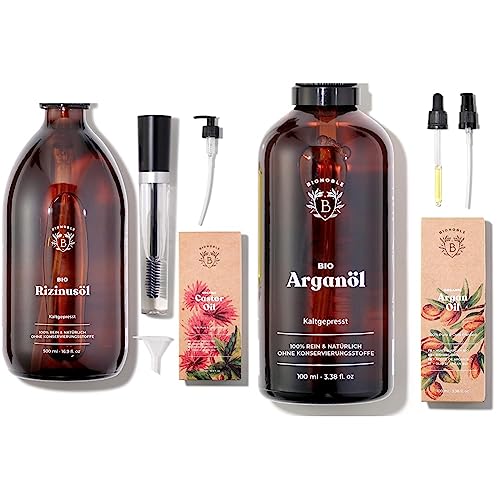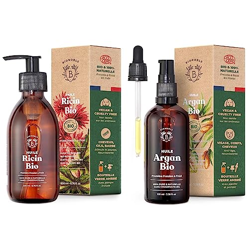 Bionoble Huile de Ricin Bio 200ml - Huile Pousse Cheveux, Cils, Sourcils, Barbe et Ongles - Vegan Castor Oil - Bouteille en Verre + Pompe & Huile d'Argan Bio 100ml - Huile Argan Bio Vegan Végétale