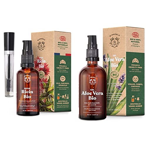 Bionoble Huile de Ricin Bio 50ml - 100% Pure, Naturelle et Pressée à Froid - Cils, Sourcils, Corps, Cheveux, Barbe, Ongles & Gel Aloe Vera Bio 100% Pur Aloe 100ml - Flacon Verre Recyclable + Pompe