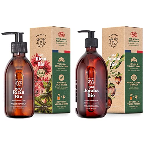 Bionoble Huile de Ricin Bio 200ml - Huile Pousse Cheveux, Cils, Sourcils, Barbe et Ongles - Huile Cheveux & Huile de Jojoba Bio 200ml - 100% Pure, Naturelle et Pressée à Froid - Visage, Corps, Cheveux