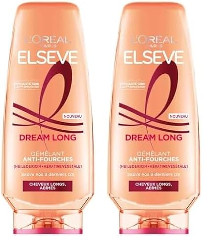 L'Oréal Paris - Après-Shampooing Démêlant Anti-Fourches - Pour Cheveux Long et Abîmés - Enrichi en Kératine Végétale et Huile de Ricin - Elseve Dream Long - 200 ml (Lot de 2)