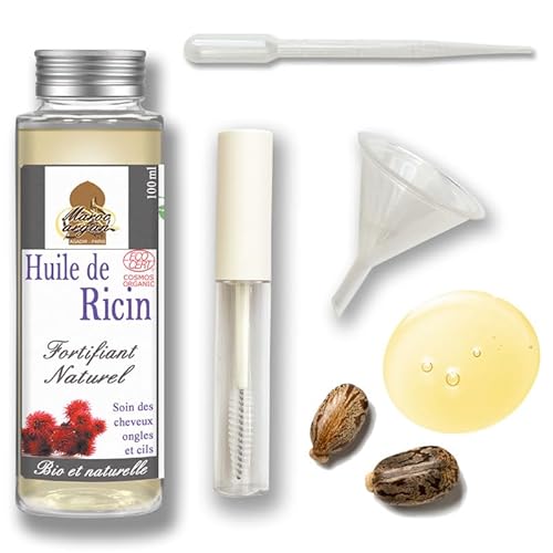 Kit Mascara – Huile de Ricin 100ml + Pipette applicatrice, flacon avec brosse, entonnoir - Cheveux, cils et ongle – 100% BIO Certifié par Ecocert – Pressée à froid.