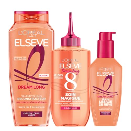 L’ORÉAL PARIS - Routine Soins Capillaires Cheveux Longs - Longueurs réparées - Kératine Végétale & Huile de Ricin - Shampooing, Soin Magique 8 secondes, Crème Sauveuse de Pointes - Elseve Dream Long