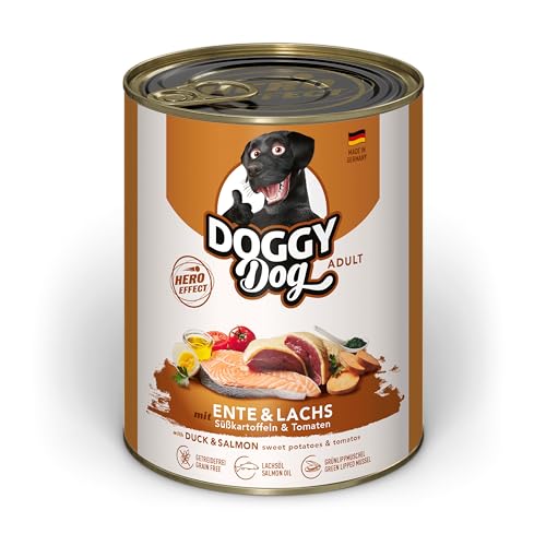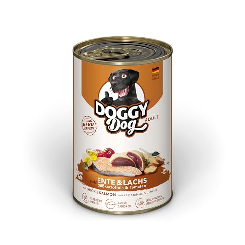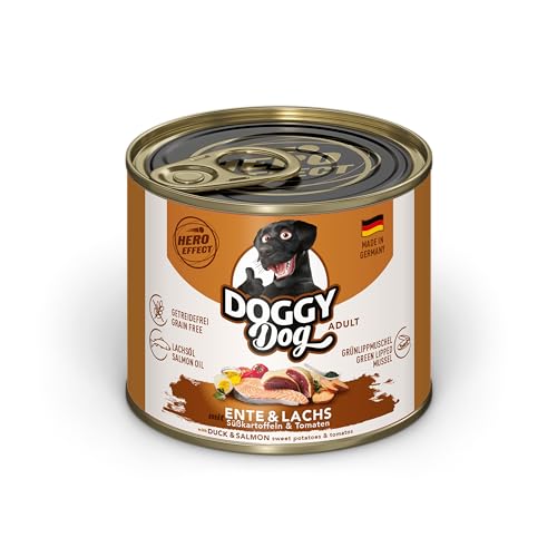 Doggy Dog Paté Canard & Saumon, 6 x 400 g, Nourriture Humide pour Chien, sans céréales, avec Huile de Saumon et Moule à lèvres Vertes, Aliment Complet avec patate Douce et Tomate, fabriqué en