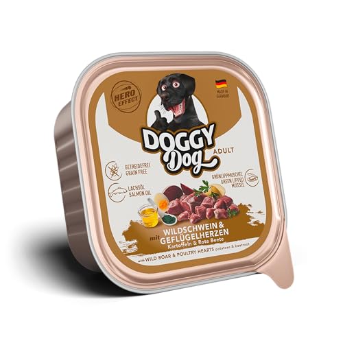 DOGGY Dog Paté Sanglier et cœur de volaille, 10 x 150 g, Nourriture Humide pour Chien, sans céréales, avec Huile de Saumon, Aliment Complet avec Pommes de Terre et betteraves, fabriqué en Allemagne