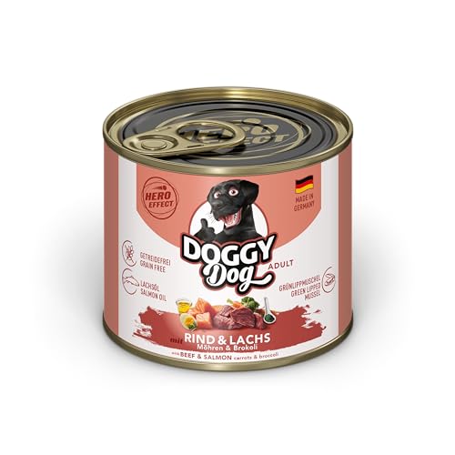 DOGGY Dog Paté Boeuf & Saumon 6 x 800 g Nourriture Humide pour Chien Nourriture pour Chien sans céréales avec Huile de Saumon et Moule à lèvres Vertes, Aliment Complet avec Carotte et Brocoli,