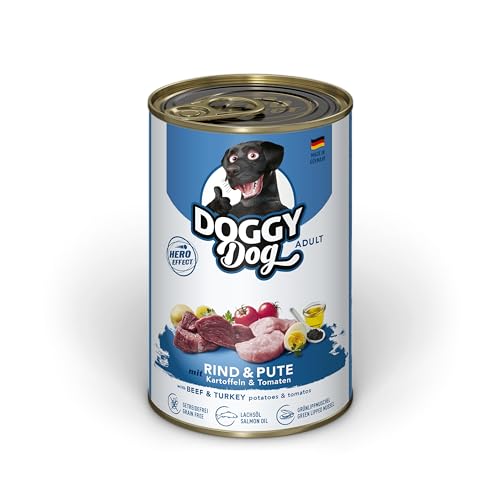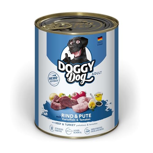 Doggy Dog Paté Boeuf & Dinde, 6 x 400 g, Nourriture Humide pour Chien, sans céréales, avec Huile de Saumon et Moule à lèvres Vertes, Aliment Complet avec Pommes de Terre et Tomate, fabriqué en