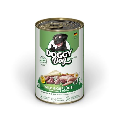 Doggy Dog Paté Wild & Volaille - 6 x 400 g - Nourriture Humide pour Chien - sans céréales - avec Huile de Saumon et Moule à lèvres Vertes - Aliment Complet avec panais et Carotte - Fabriqué en