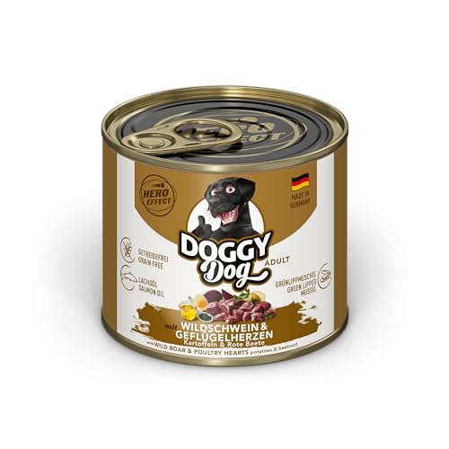 Doggy Dog Paté Sanglier et cœur de volaille, 6 x 200 g, Nourriture Humide pour Chien, sans céréales, avec Huile de Saumon, Aliment Complet avec Pommes de Terre et betteraves, fabriqué en Allemagne