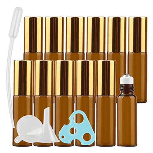 ZEOABSY 12 Pièce Marron Flacon Roll on Vide5ml, Flacon Roll on en Verre avec Bille en Acier Inoxydable, Bouchon de Bouteille doré, pour Huile Essentielle, Aromathérapie, Parfum, Massage