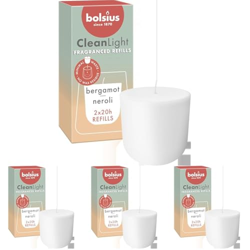 Bolsius - Recharge CleanLight - Bougie parfumée rechargeable - 2 pièces - Bergamote et néroli - Longue durée de combustion 20 heures - Cire naturelle végétalienne - Sans huile de palme (Lot de 4)