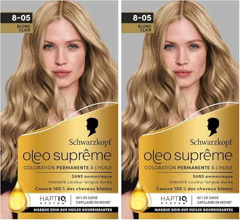 Schwarzkopf – Oleo Suprême – Coloration Permanente à l’Huile – Couleur et Eclat Longue Durée – sans Ammoniaque – Couvre 100% des Cheveux Blancs – HaptIQ Système – Blond Clair 8-05 (Lot de 2)