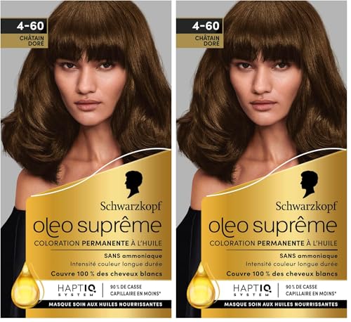 Schwarzkopf – Oleo Suprême – Coloration Permanente à l’Huile – Couleur et Eclat Longue Durée – sans Ammoniaque – Couvre 100% des Cheveux Blancs – HaptIQ Système – Châtain Doré 4-60 (Lot de 2)