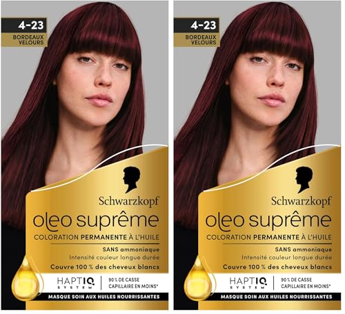 Schwarzkopf – Oleo Suprême – Coloration Permanente à l’Huile – Couleur et Eclat Longue Durée – sans Ammoniaque – Couvre 100% des Cheveux Blancs – HaptIQ Système – Bordeaux Velours 4-23 (Lot de 2)