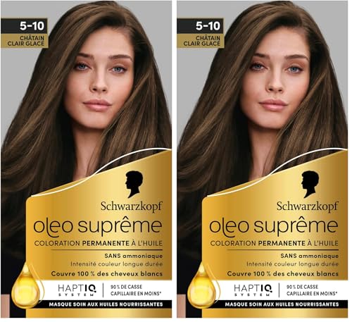 Schwarzkopf – Oleo Suprême – Coloration Permanente à l’Huile – Couleur et Eclat Longue Durée – sans Ammoniaque – Couvre 100% des Cheveux Blancs – HaptIQ Système – Châtain Clair Glacé 5-10 (Lot de 2)
