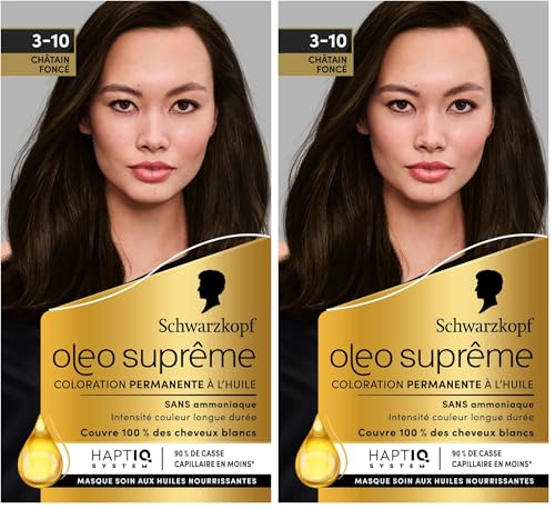 Schwarzkopf – Oleo Suprême – Coloration Permanente à l’Huile – Couleur et Eclat Longue Durée – sans Ammoniaque – Couvre 100% des Cheveux Blancs – HaptIQ Système – Châtain Foncé 3-10 (Lot de 2)
