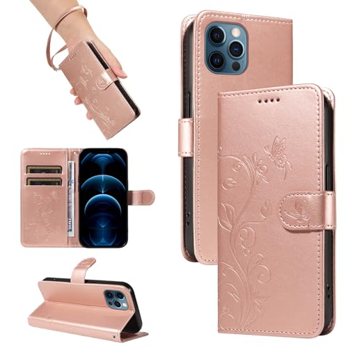 DENDICO Coque pour iPhone 13 Pro Max, Papillon Imprimé Housse en Cuir PU Magnétique Portefeuille, Étui à Rabat pour iPhone 13 Pro Max, Or Rose