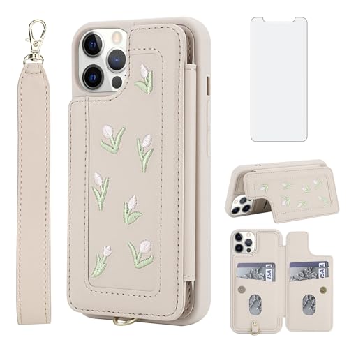 Asuwish Coque pour iPhone 13 Pro Max Portefeuille avec Verre Trempé et Support Cordon Porte Carte Chaine PU Cuir Étui Housse i 13Pro ProMax Téléphone Vitre Protection Protege Ecran Case Femme Beige