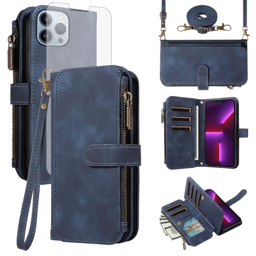 Asuwish Coque pour iPhone 13 Pro Max Portefeuille avec Verre Trempé et Cordon Porte Carte Chaine PU Cuir à Clapet Étui Housse Support i 13Pro ProMax Téléphone Case Vitre Protection Protege Femme Bleu