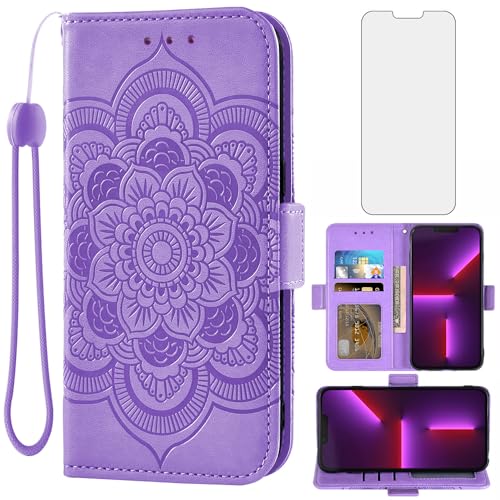 Asuwish Coque pour iPhone 13 Pro Max Portefeuille avec Verre Trempé et Porte Carte Chaine PU Cuir à Clapet Mandala Étui Housse Support i 13Pro ProMax MaxHülle Fleur Vitre Téléphone Case Femme Violet