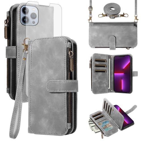 Asuwish Coque pour iPhone 13 Pro Max Portefeuille avec Verre Trempé et Cordon Porte Carte Chaine PU Cuir à Clapet Étui Housse Support i 13Pro ProMax Téléphone Case Vitre Protection Protege Femme Gris