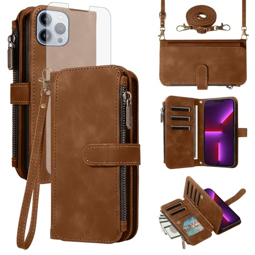 Asuwish Coque pour iPhone 13 Pro Max Portefeuille avec Verre Trempé et Cordon Porte Carte Chaine PU Cuir à Clapet Étui Housse Support i 13Pro ProMax Téléphone Case Vitre Protection Ecran Femme Marron