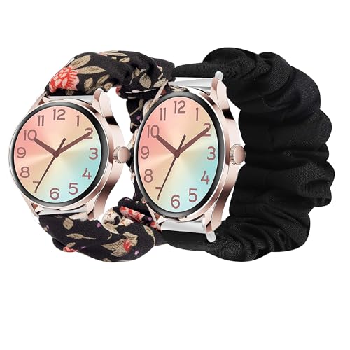 Lamshaw Chouchou Bracelet Compatible avec Ice Smart 2.0 1,2 Pouces SmartWatch, en Tissu Imprimé Élastique Bracelet de Montre du Compatible avec Ice Smart 3.0 Smartwatch (2 Packs-Noir+fleurs noires)