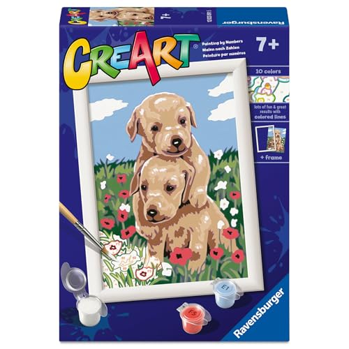 Ravensburger - CreArt Série E : Golden Retriever Choisis, Peindre avec des numéros, Kit de peinture pour enfants, cadre inclus, jeu éducatif et créatif, idée cadeau enfants 7 ans, 13 x 18 cm