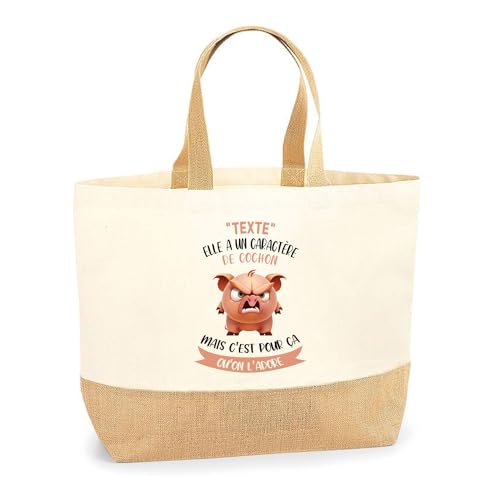 Planetee Sac Cabas de Plage Personnalisable | Toile de Jute Coton Courses Idée Cadeau Collègue Amie Maman Papa (Caractère de Cochon - femme)